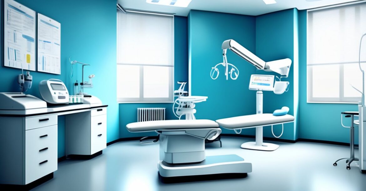 Nowoczesne wnętrze gabinetu proktologicznego w Koszalinie, emanujące spokojem i profesjonalizmem, z subtelnie widocznym sprzętem medycznym.